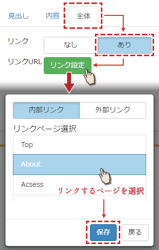 内部リンクの設定は、リンク先のページを選択し、「保存」ボタンを押すだけです。