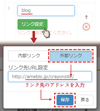 内部リンクの場合はページを、外部リンクの場合はアドレス(URL)を入力し、「保存」ボタンを押します。