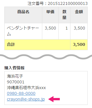 受注通知メールには、注文があった商品と、購入金額、支払方法、購入者の名前や住所、メールアドレスなどの情報が記載されています。