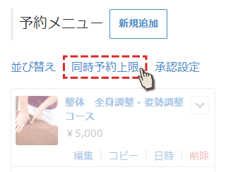 予約メニュー一覧の「同時予約上限」から設定できます。