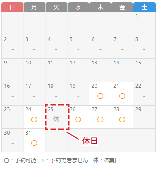 例えば「受付締切」を「3日前」に設定し、Web予約の画面を見に行くと、今から3日間は「×」になり、3日後から予約可能になります。